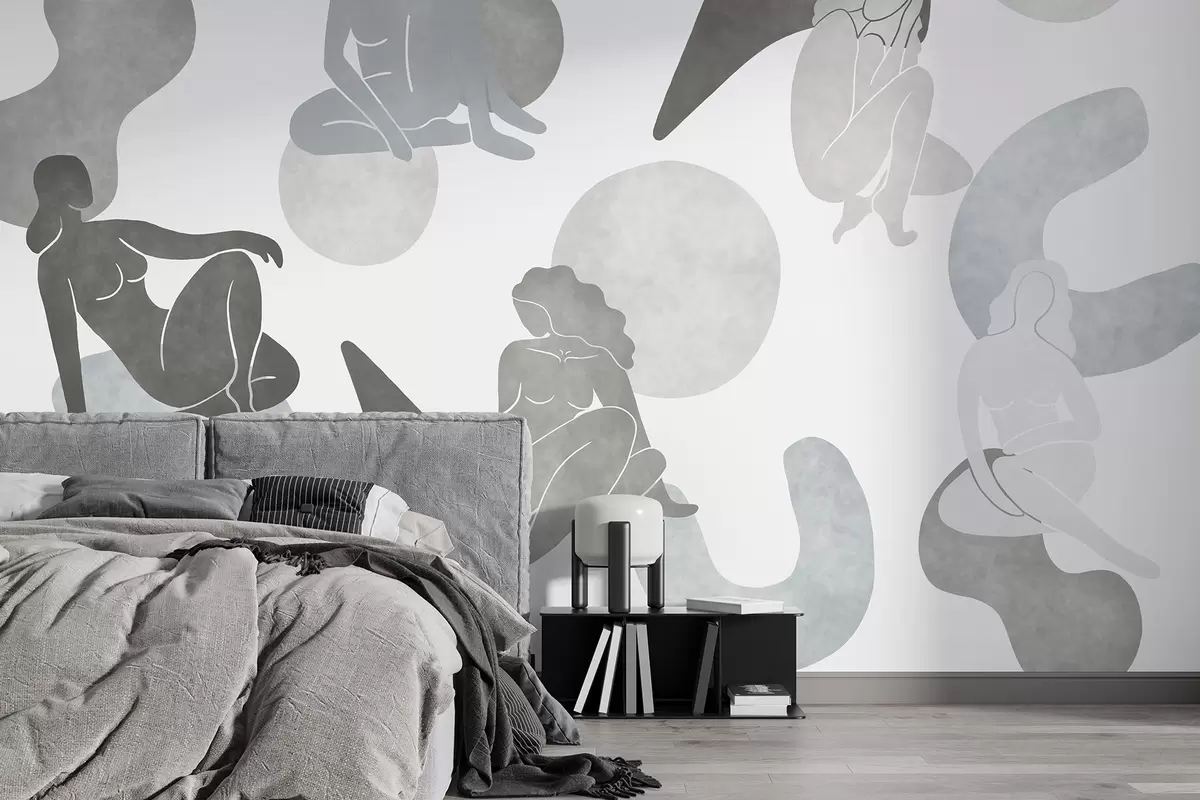 Fototapet Geometriske abstraktioner med kvindelige silhuetter, boho-stil, grå farver Nr. w03753v5