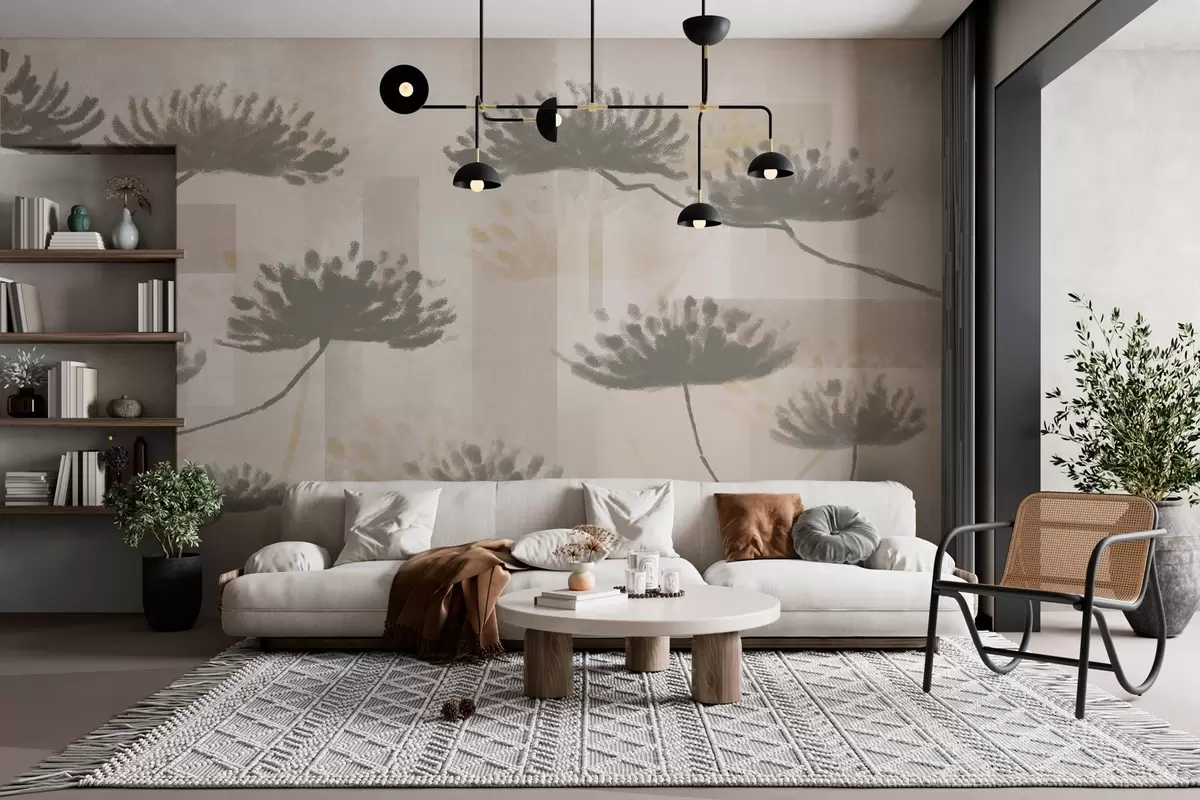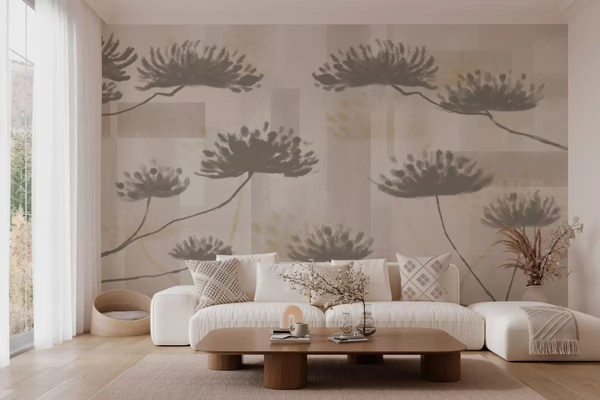 Fototapet struktureret geometri i beige og cremefarvede toner med stiliserede paraplyblomster Nr. w03960