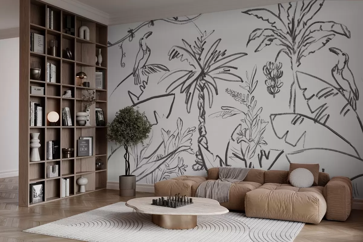 Fototapet Tropisk stregtegning, bananer, palmer, konturgrafik Nr. w04020