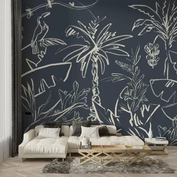 Fototapet Tropisk mønster på mørkeblå baggrund, palmer, bananer Nr. w04020v4