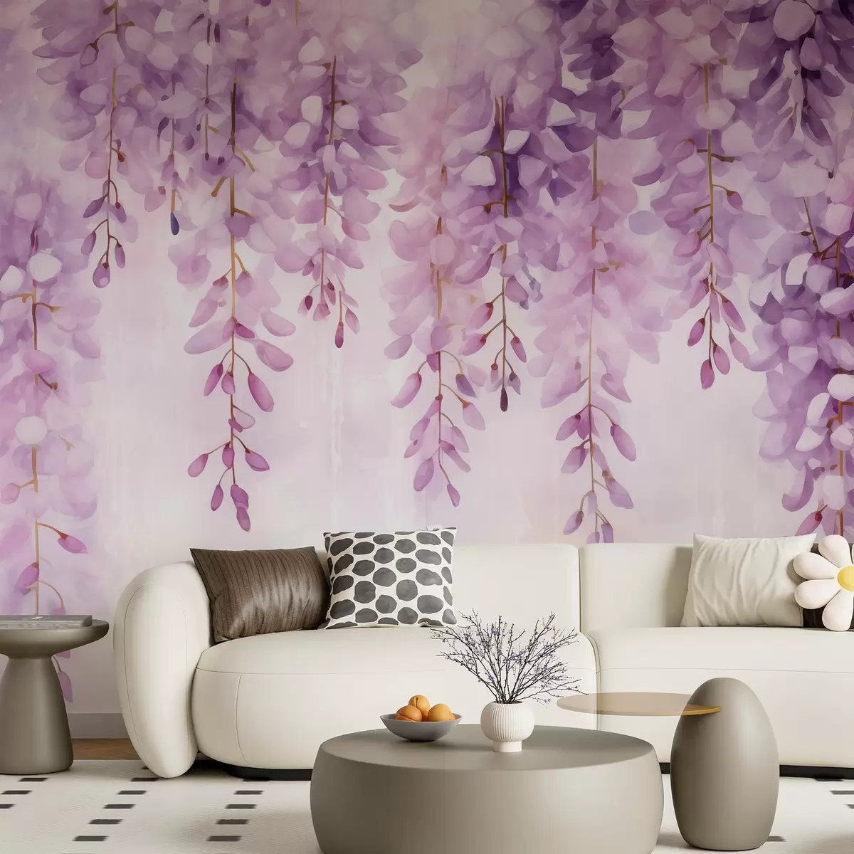 Fototapet Delikat akvarelkomposition med brusende blåregn i bløde lavendel- og pinkfarvede toner, der skaber en fredfyldt stemning, Nr. w04034