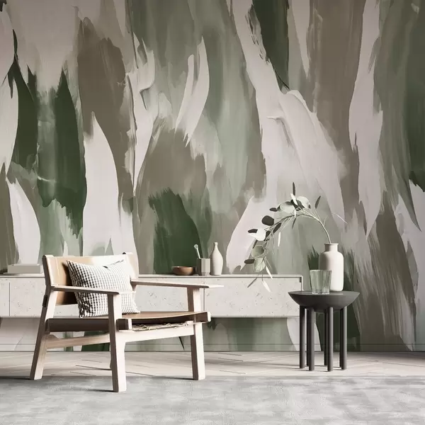 Fototapet Abstrakt penselstrøgskomposition i jordfarvet grøn, taupe og elfenben, der fremkalder en jordbunden, naturinspireret rytme Nr. w04035v1