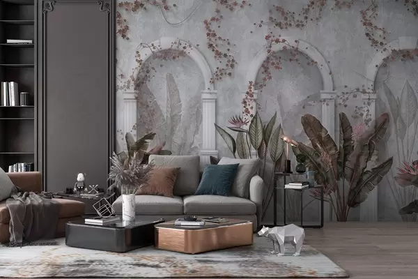 Fototapet Betonvæg med buer og tropiske planter, blomster, vinrøde farver Nr. w04065v1