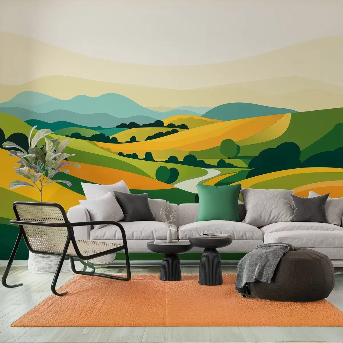 Fototapet Abstrakt landskab med bakker og træer, levende farver Nr. w04116