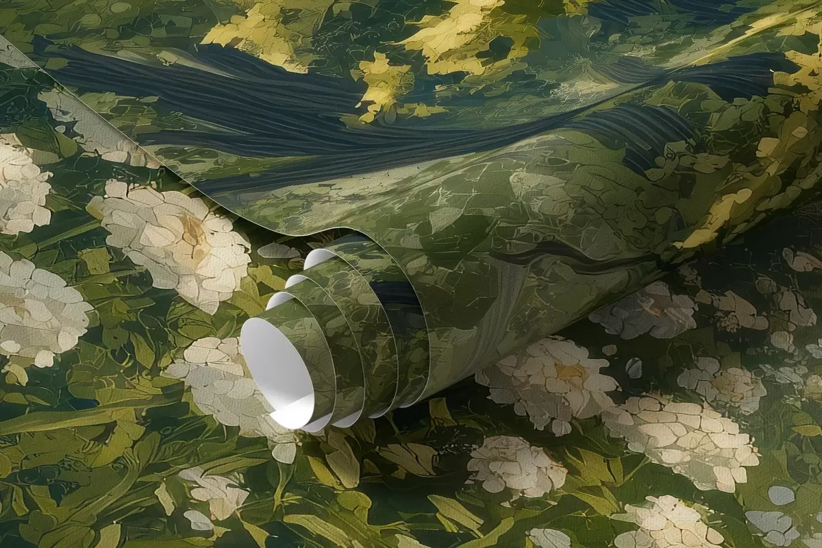Fototapet Sti i den grønne skov, hvide blomster, sollys, tegning i akrylstil Nr. w04119