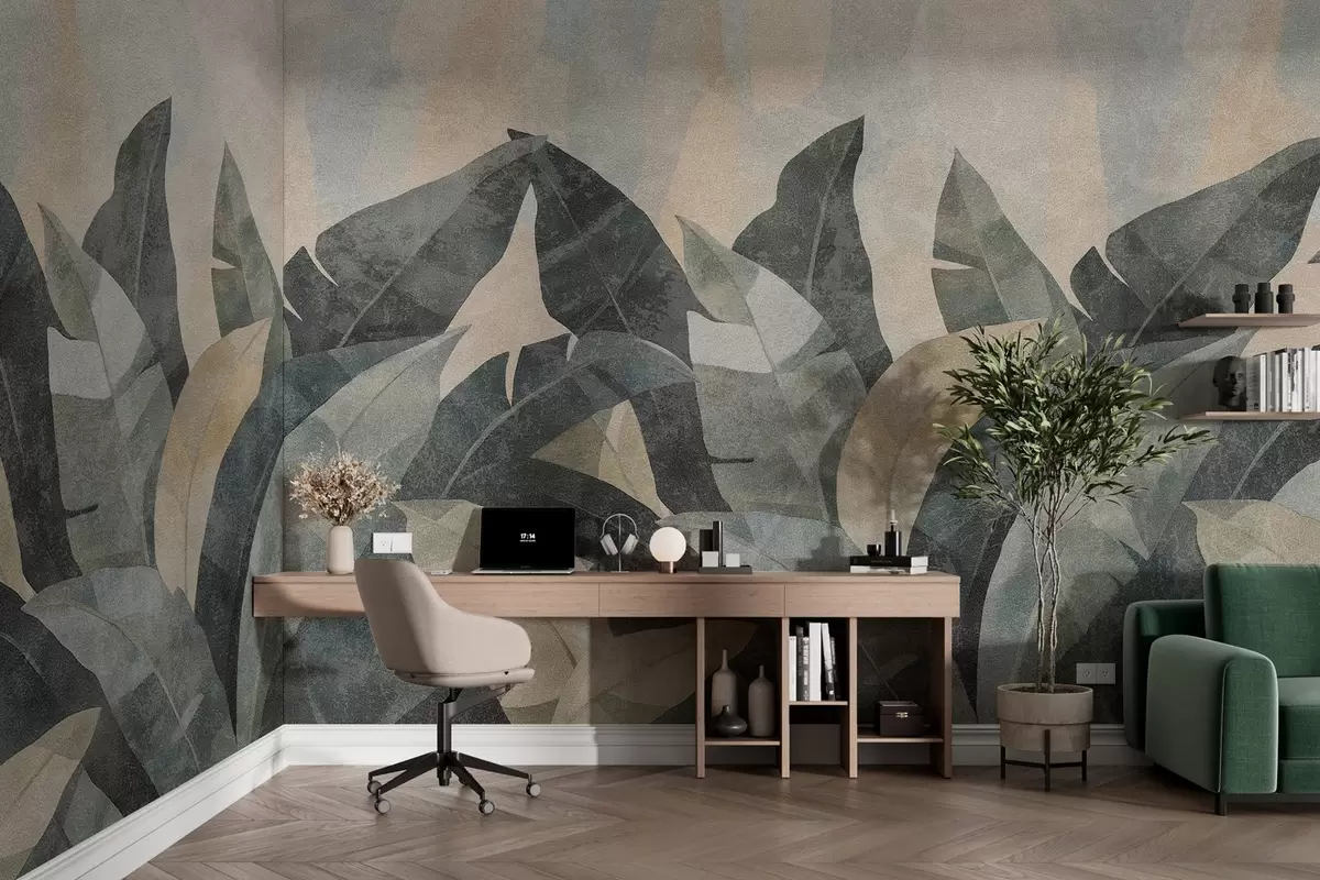 Fototapet strukturerede bananblade i naturlige nuancer af beige, grøn og grå Nr. w04285