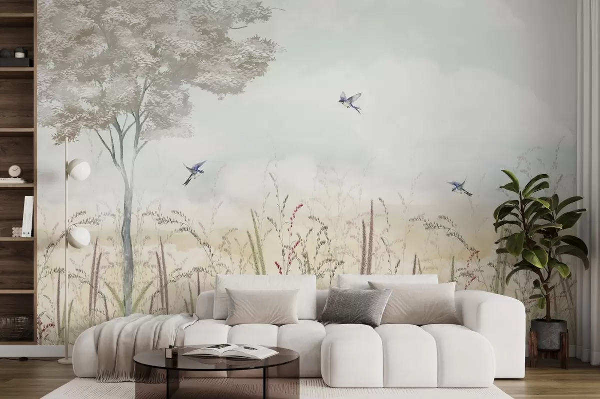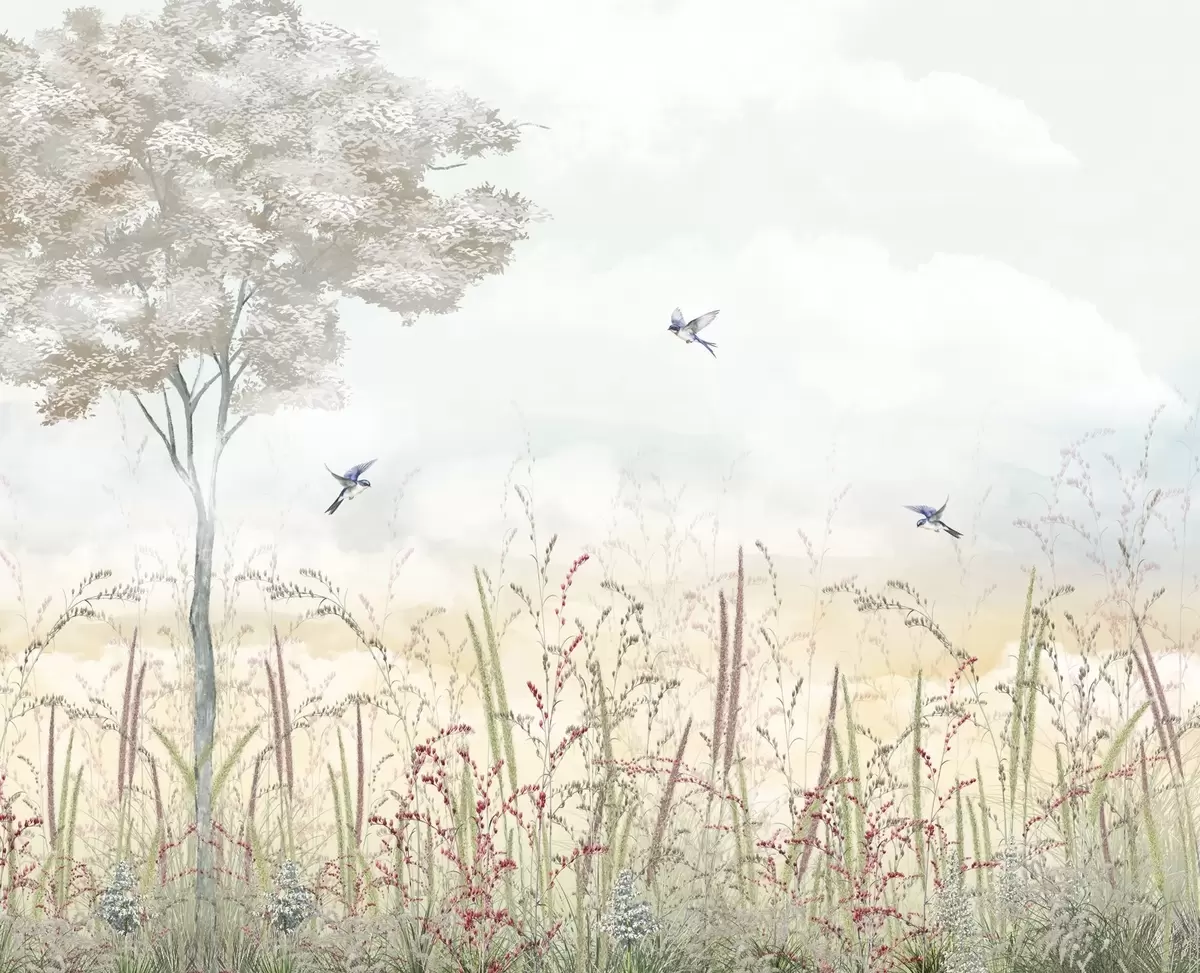 Fototapet Landskab med træ, fugle og græs på engen Nr. w04350
