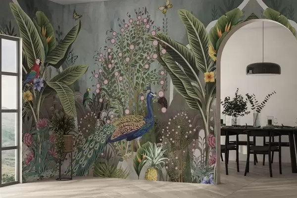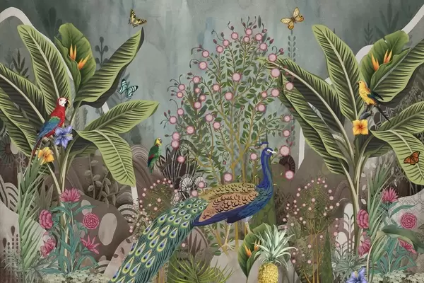 Fototapet Lyse tropiske fugle og påfugl blandt eksotiske planter Nr. w04457
