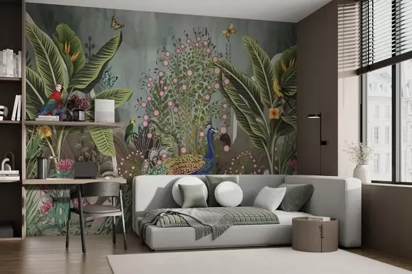 Fototapet Lyse tropiske fugle og påfugl blandt eksotiske planter Nr. w04457