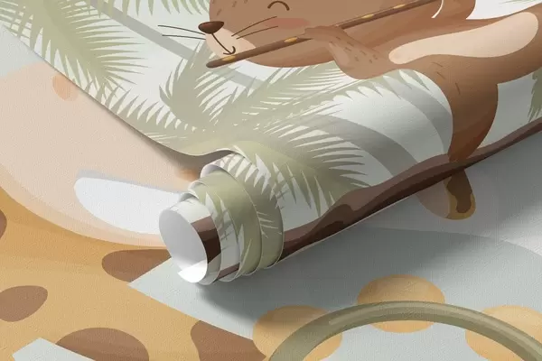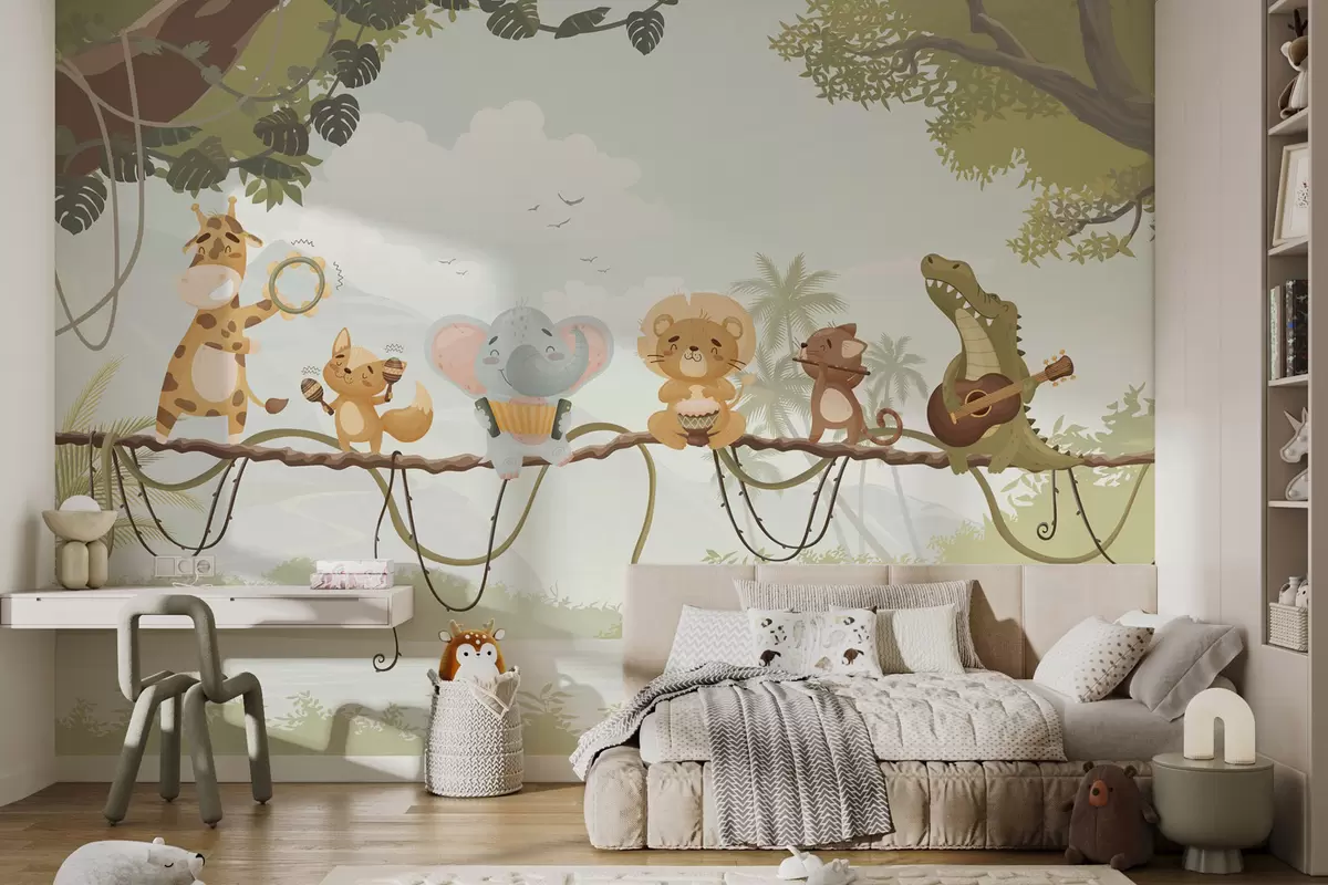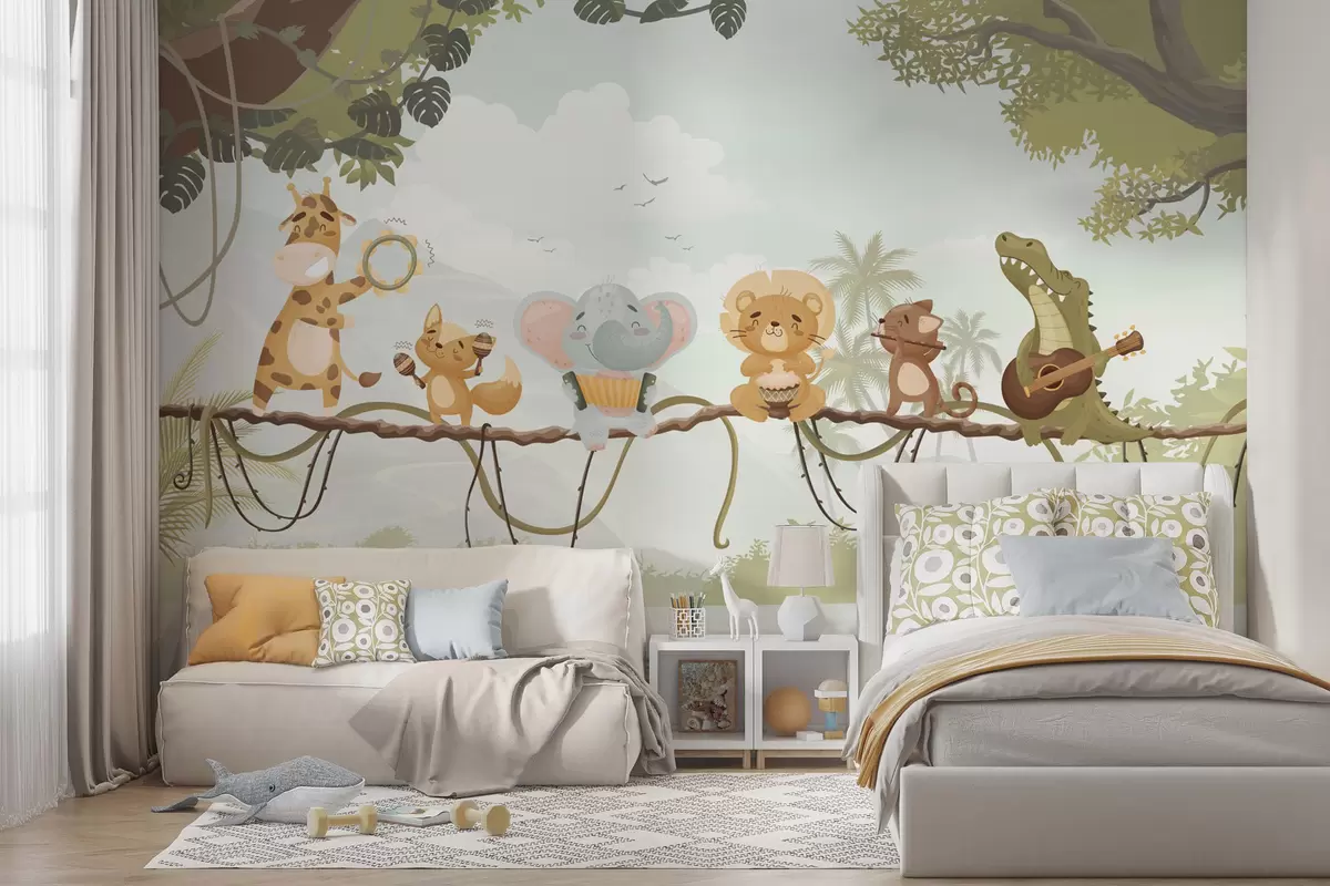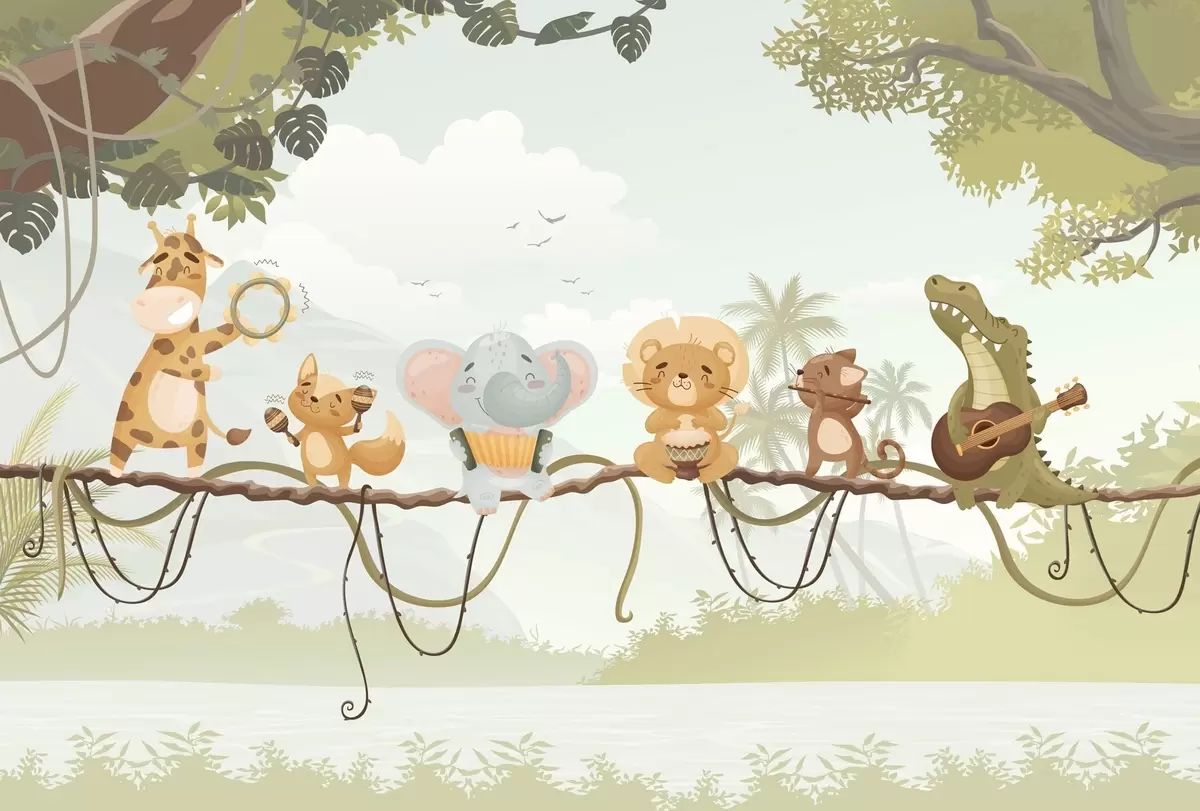 Fototapet Dyr med musikinstrumenter foran et tropisk landskab Nr. w04505v1
