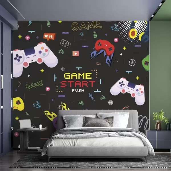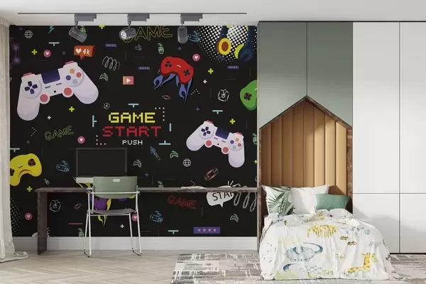 Fototapet Lyst gamer-mønster med konsoller og pixeleret tekst Nr. w04581