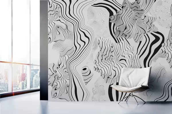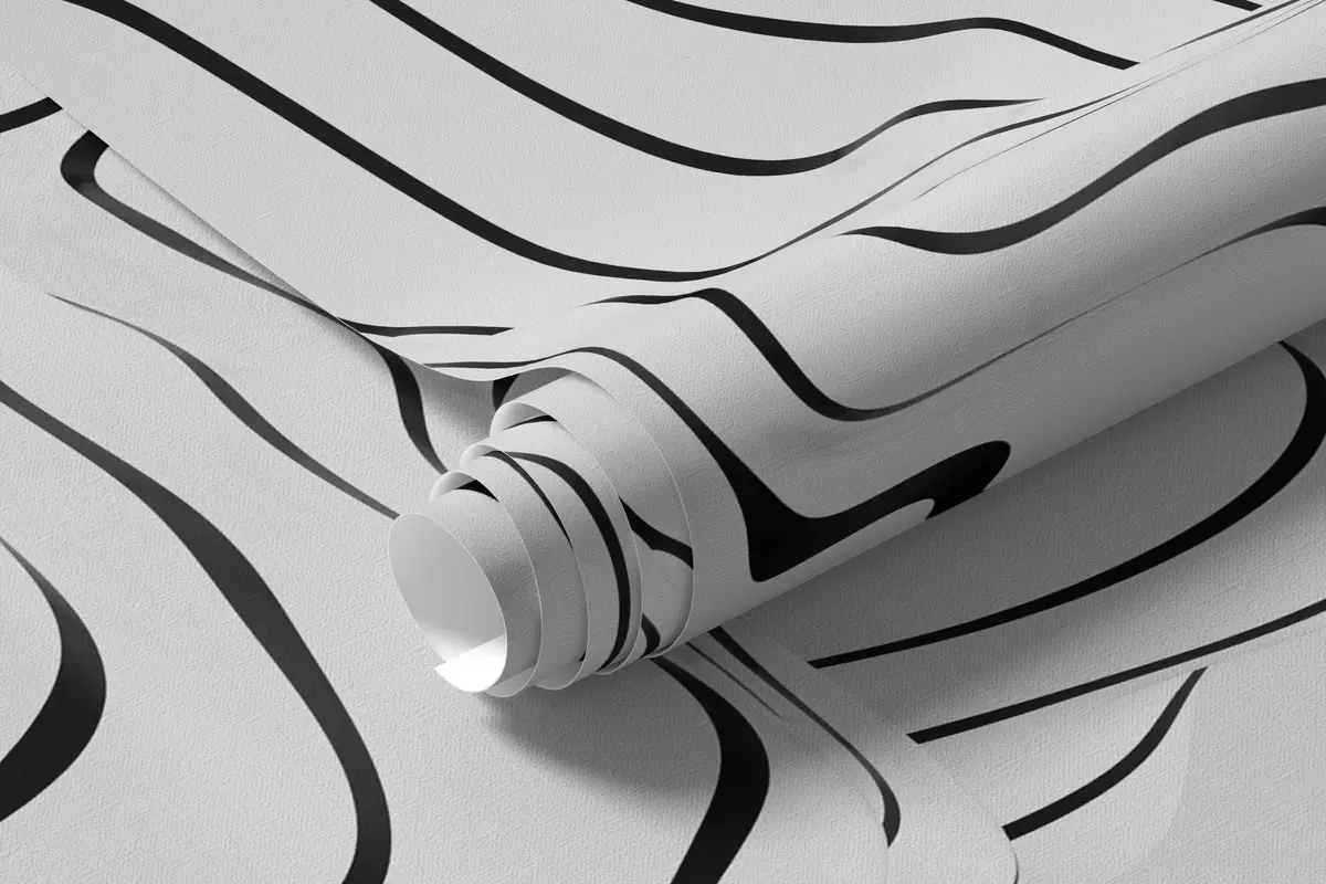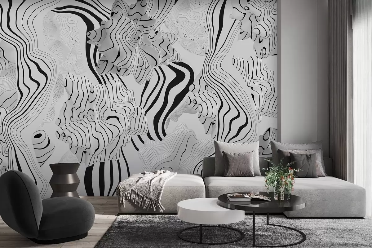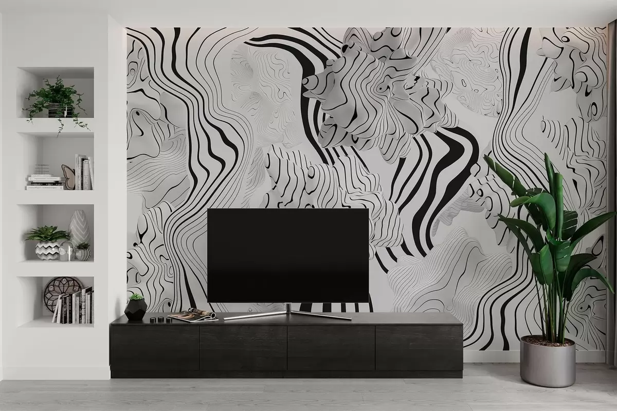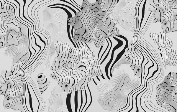 Fototapet abstrakte organiske former i 3D-stil i hvide og grå toner med sorte striber Nr. w04627