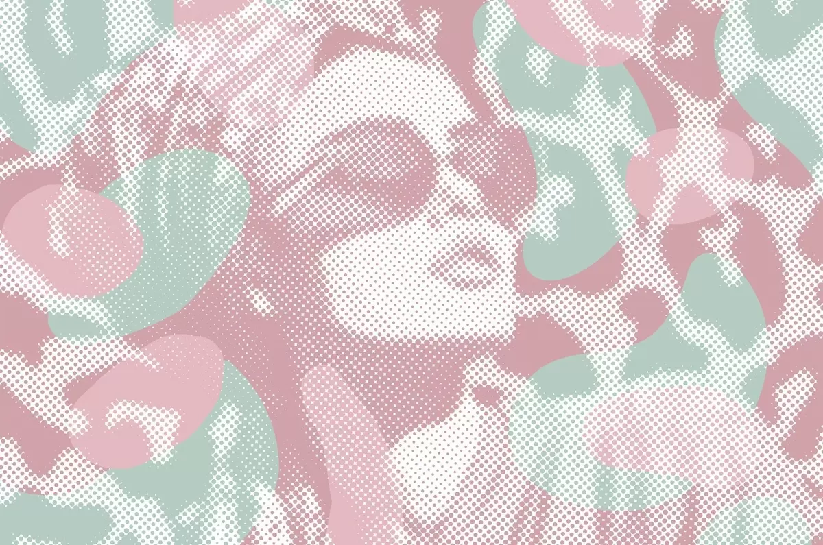 Fototapet portræt af en kvinde på en leopardbaggrund i en prikket stil i lyserøde og grønne nuancer Nr. w04630v2