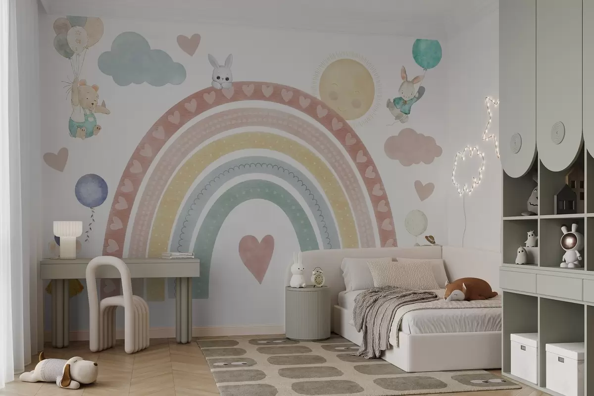 Fototapet Pastelregnbue med hjerter, dyr og balloner Nr. w04681