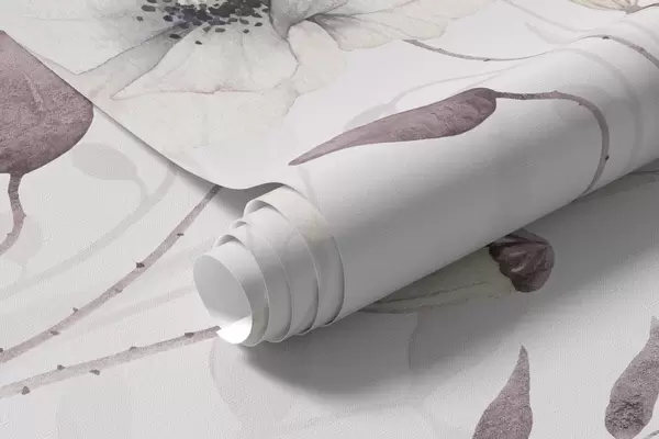 Fototapet Akvarelvalmuer med små fugle i blødt lilla Nr. w04861