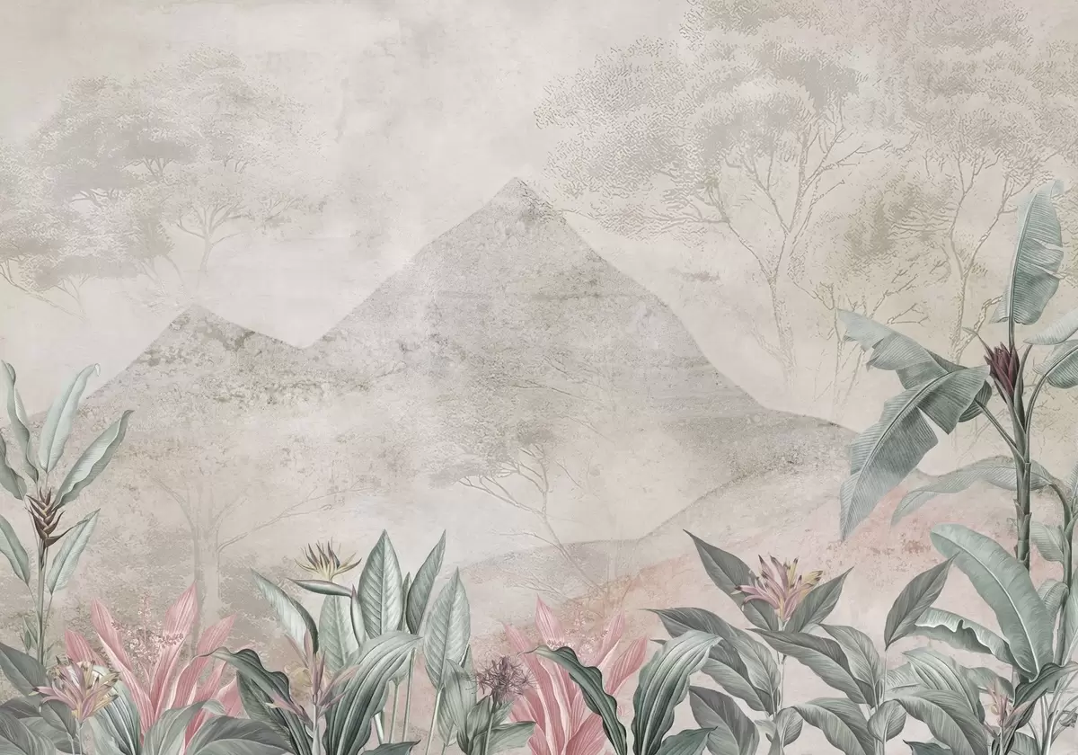 Fototapet Pastelfarvede bananblade og tropiske blomster med bjergene i baggrunden Nr. w04933
