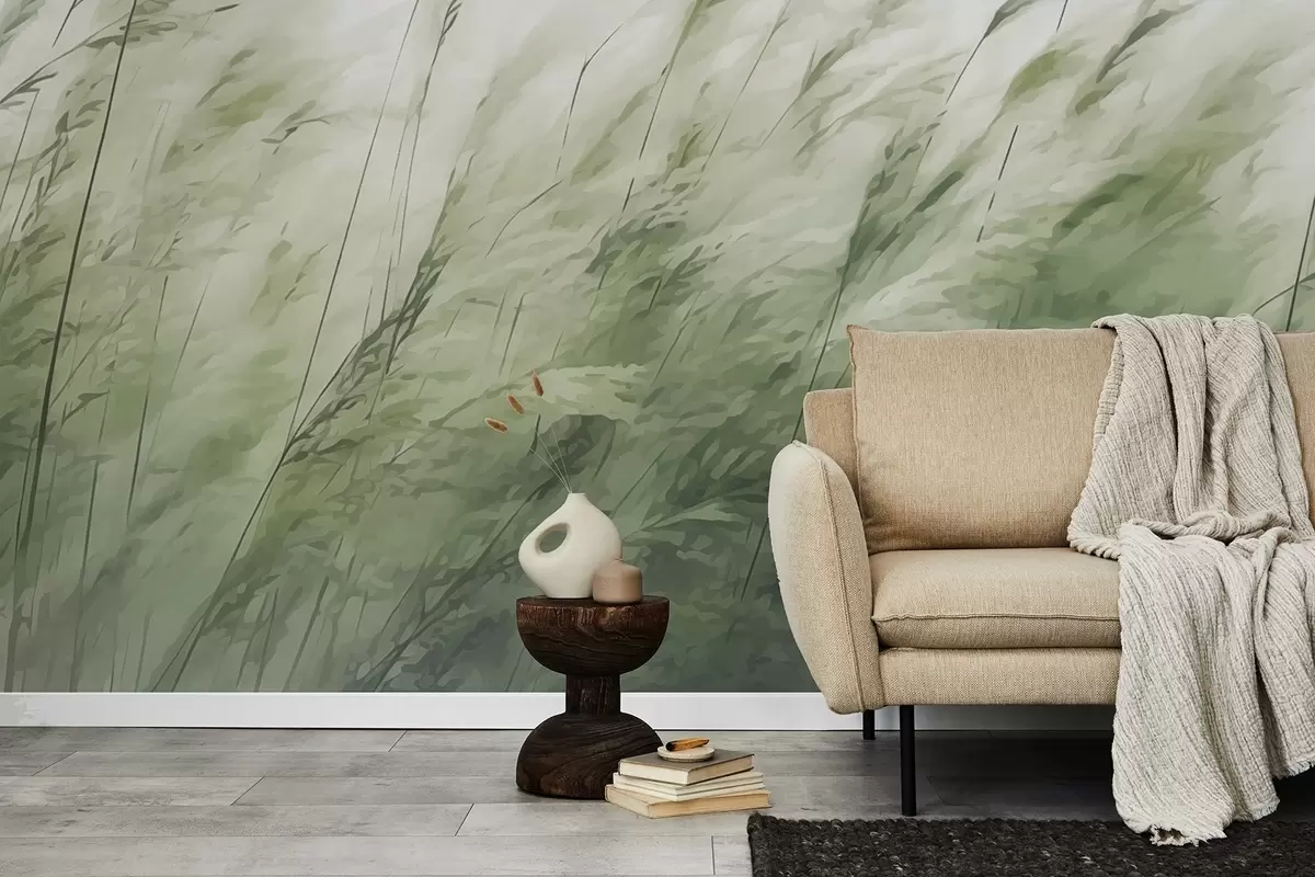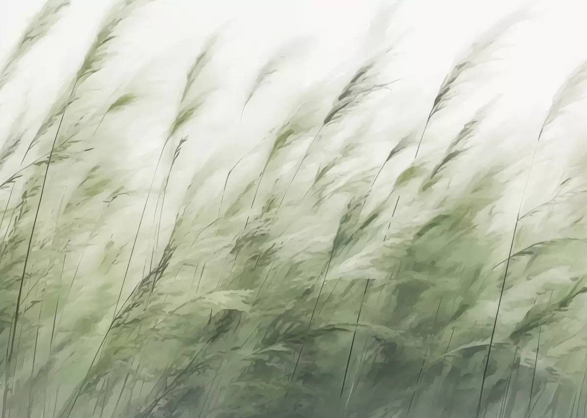 Fototapet Lette græsstrå i vinden, bløde grønne og hvide strøg Nr. w04957