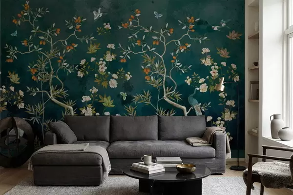 Fototapet Dekorativ scene med træer, blomster og fugle på mørk baggrund Nr. w05004