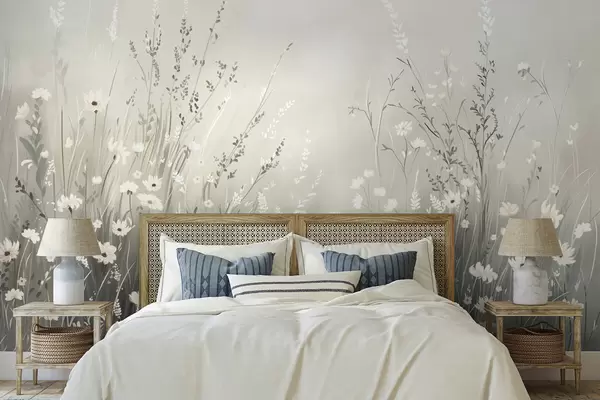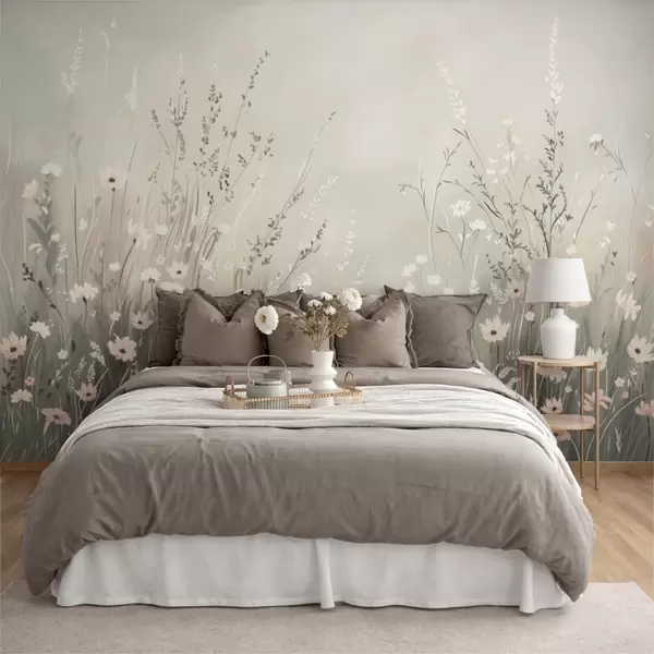 Fototapet Blid engscene med hvide blomster og fine græsser Nr. w05015v1