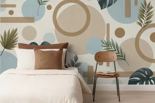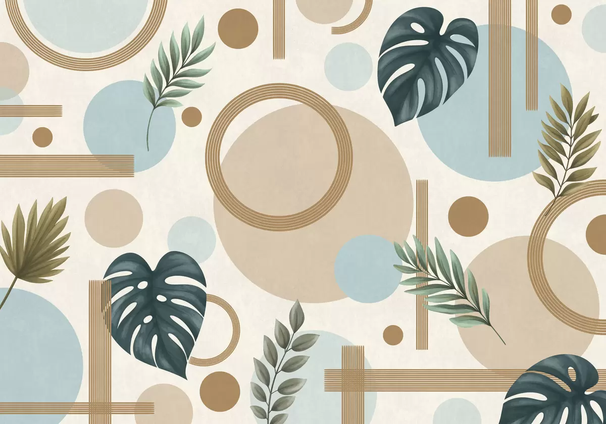 Fototapet Geometrisk mønster med blade og cirkler i rolige farver Nr. w05018