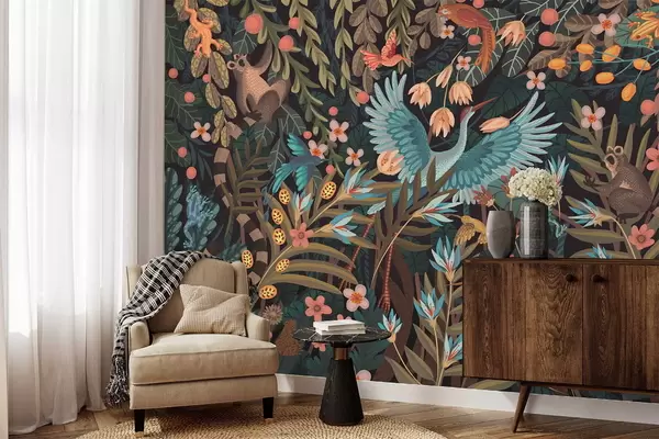 Fototapet Fantasy-scene med fugle og dyr blandt planter Nr. w05024