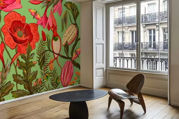 Fototapet Dekorative blomster og fugle på grøn baggrund Nr. w05036v1