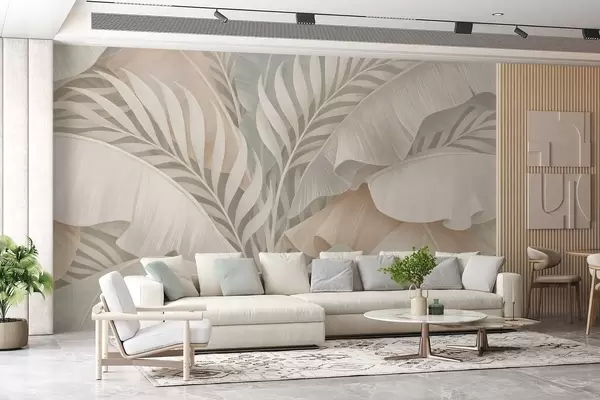 Fototapet store tropiske blade i nuancer af fersken og mat turkis Nr. w05062