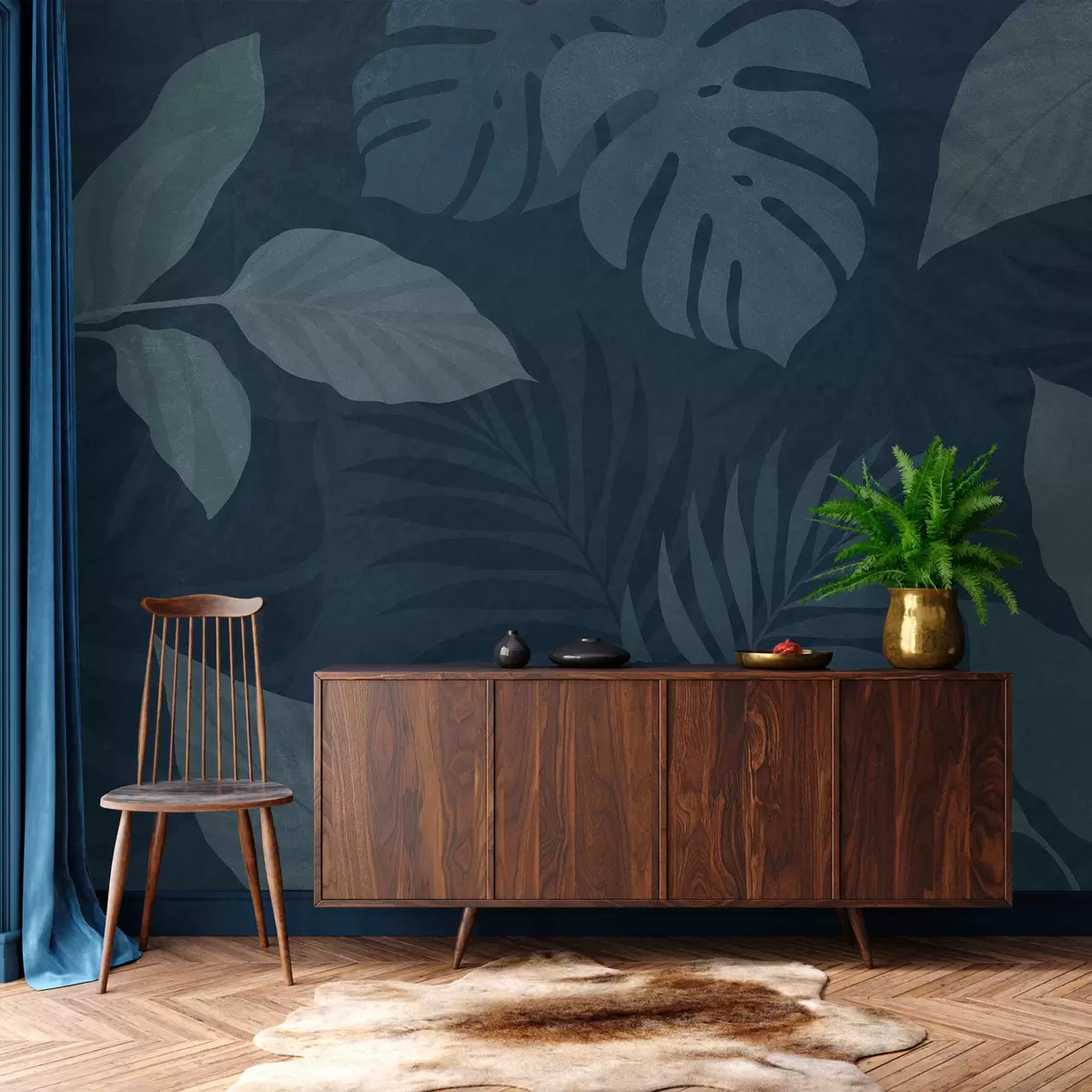 Fototapet strukturerede tropiske blade på en mørkeblå baggrund Nr. w05063v3