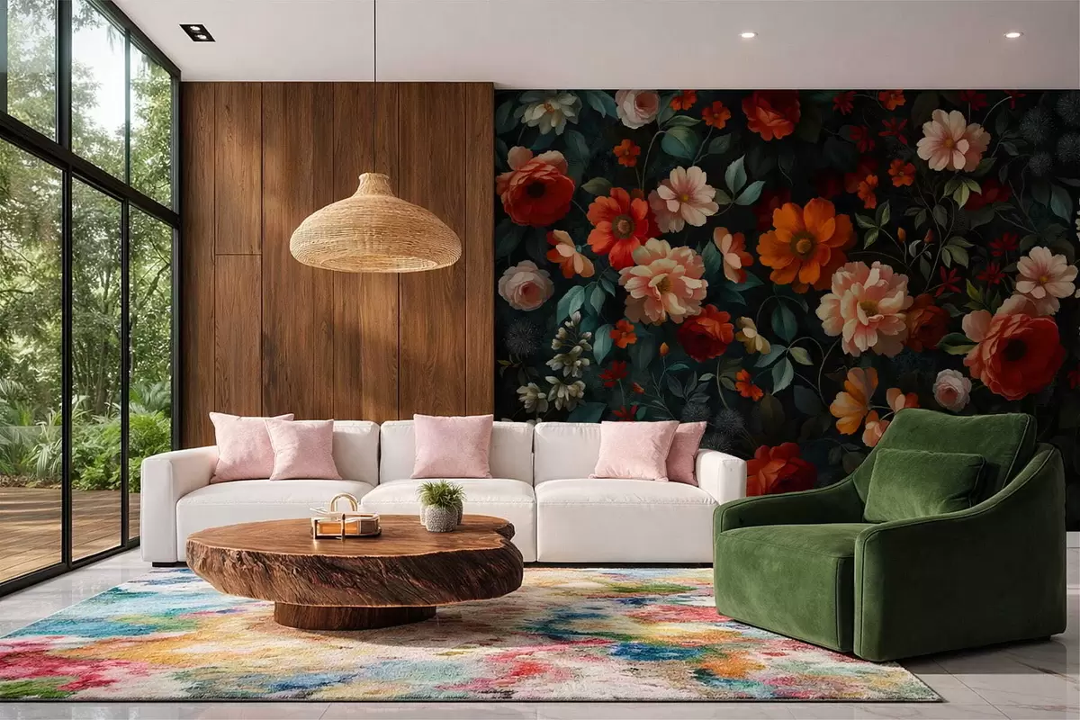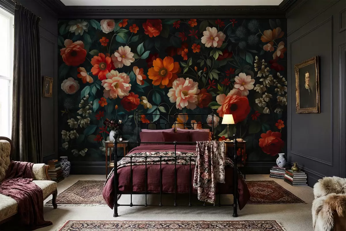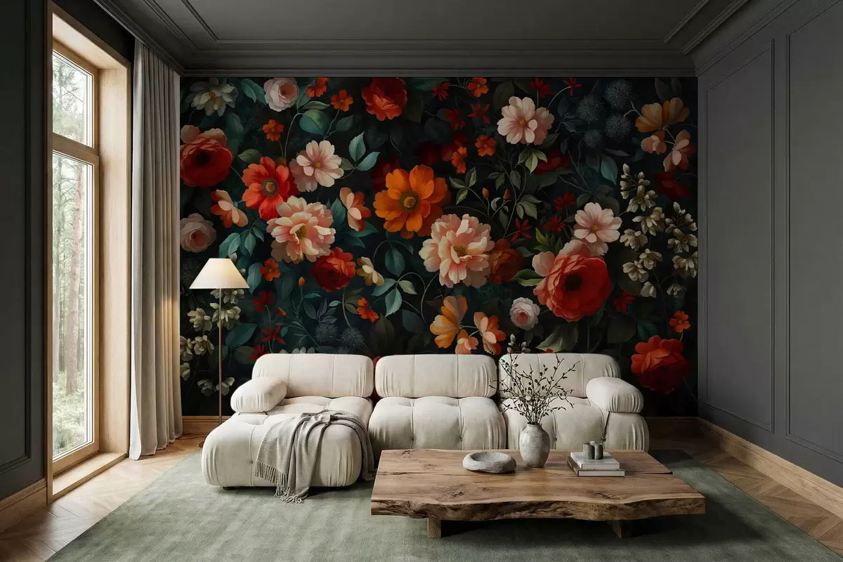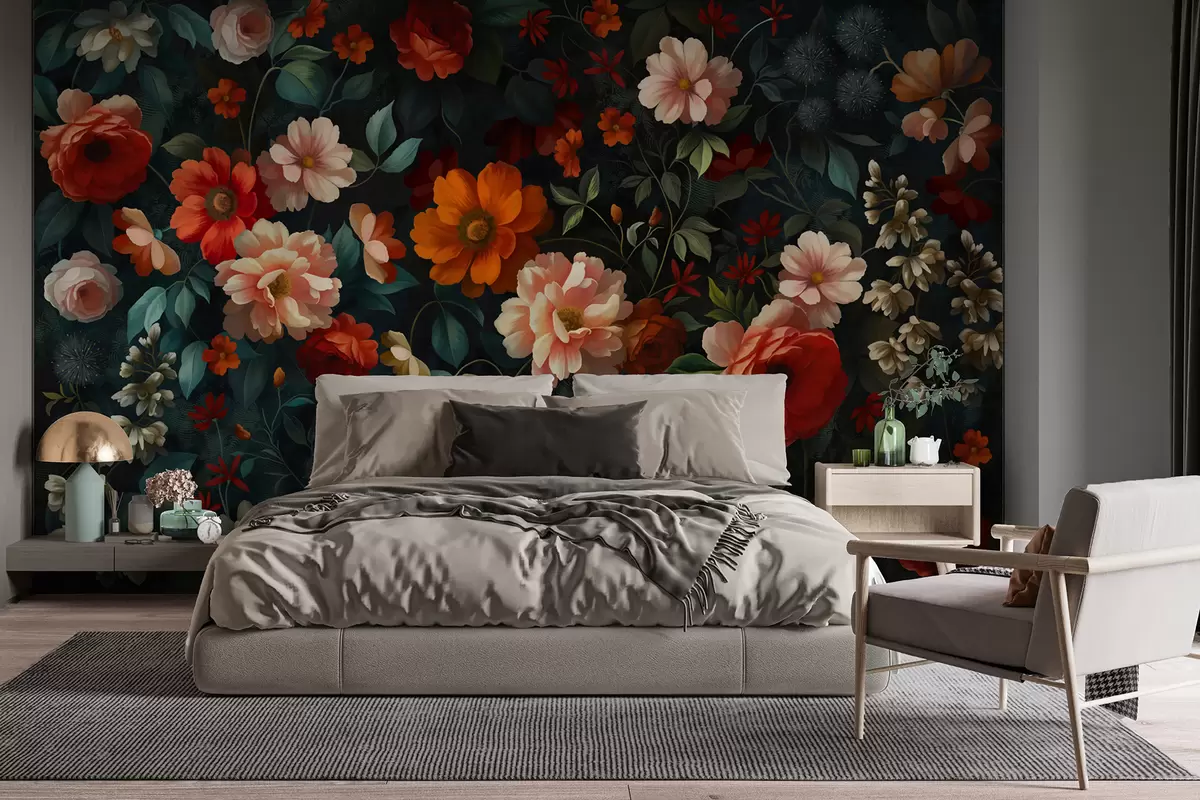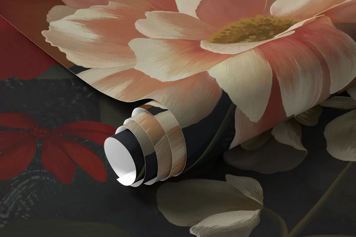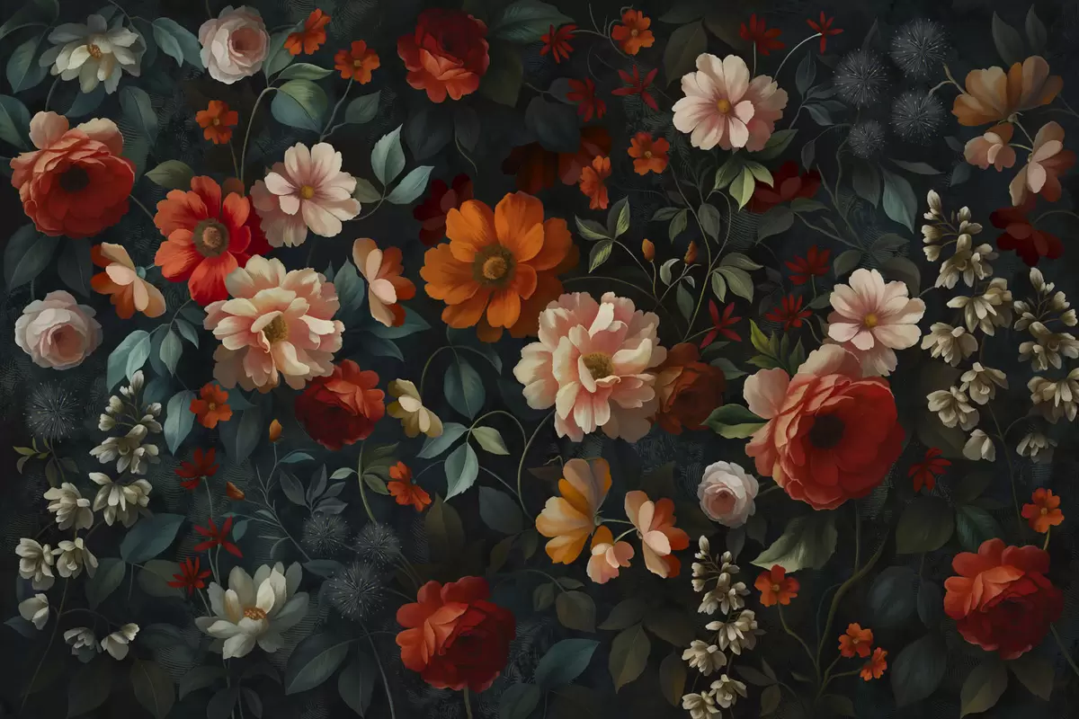 Fototapet Mørkt blomstermønster med frodige haveblomster Nr. w05087