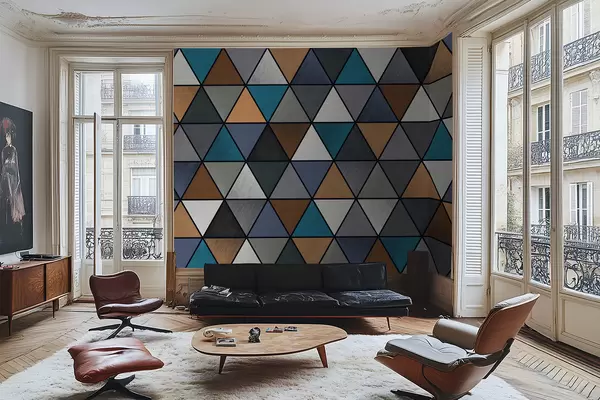 Fototapet Trekantet geometrisk mønster i blå og varme farver Nr. w05095