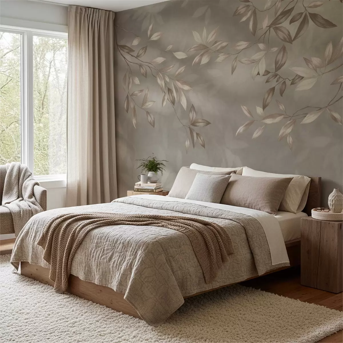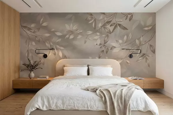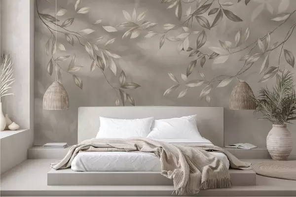 Fototapet Elegante bladrige grene i beige nuancer på en lys baggrund Nr. w05113