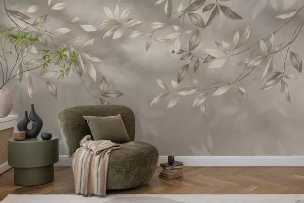 Fototapet Elegante bladrige grene i beige nuancer på en lys baggrund Nr. w05113