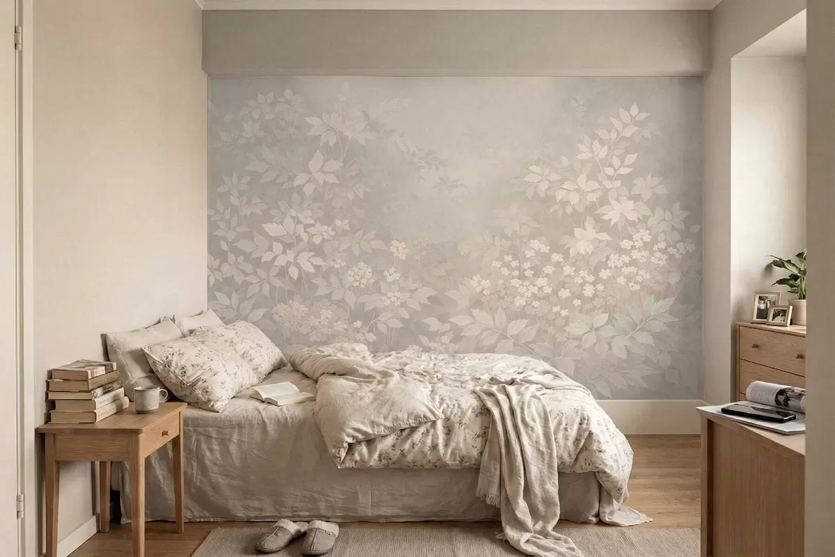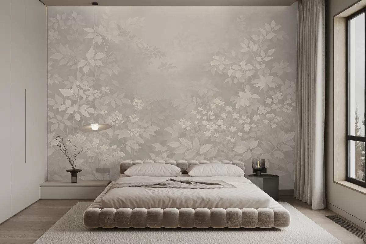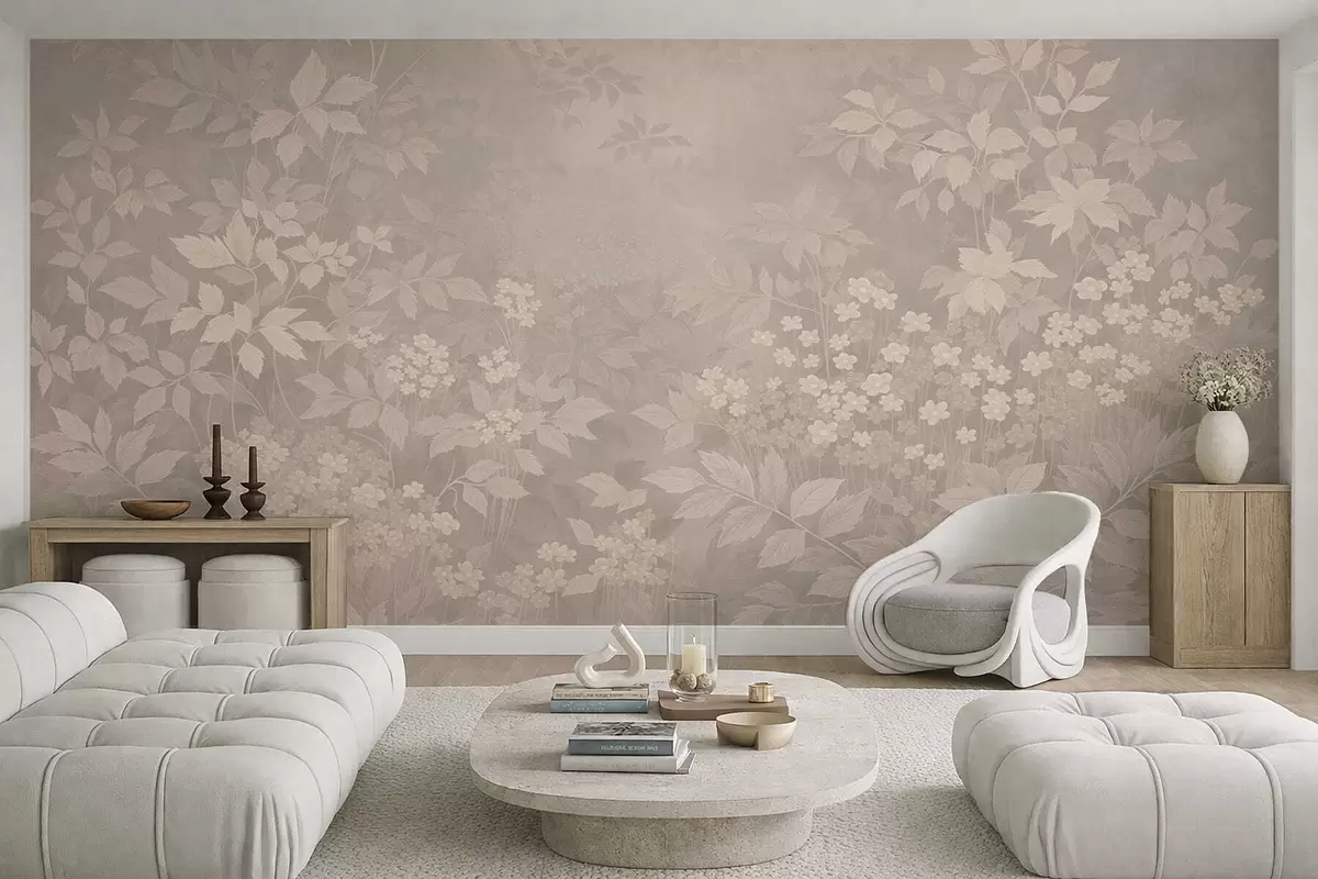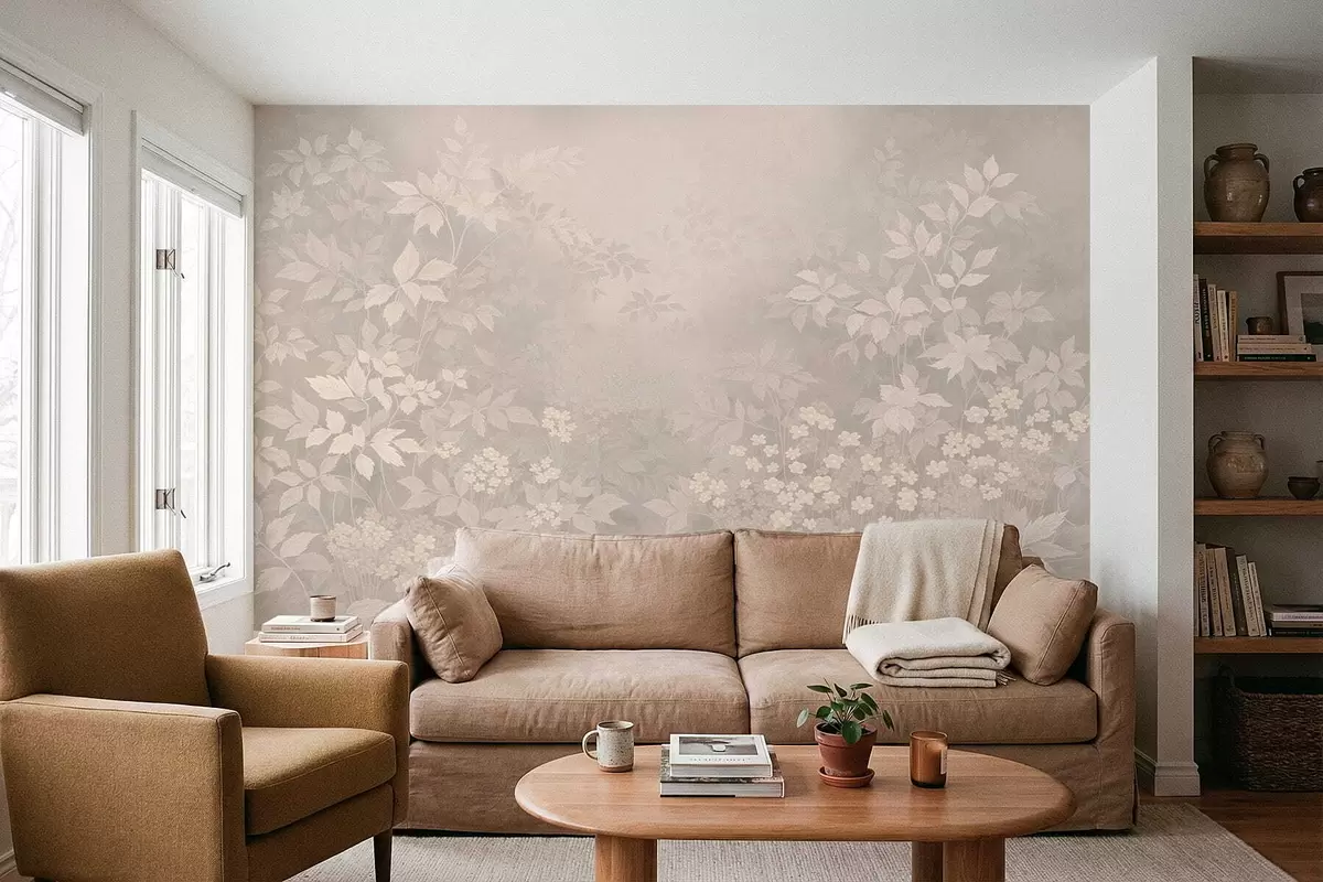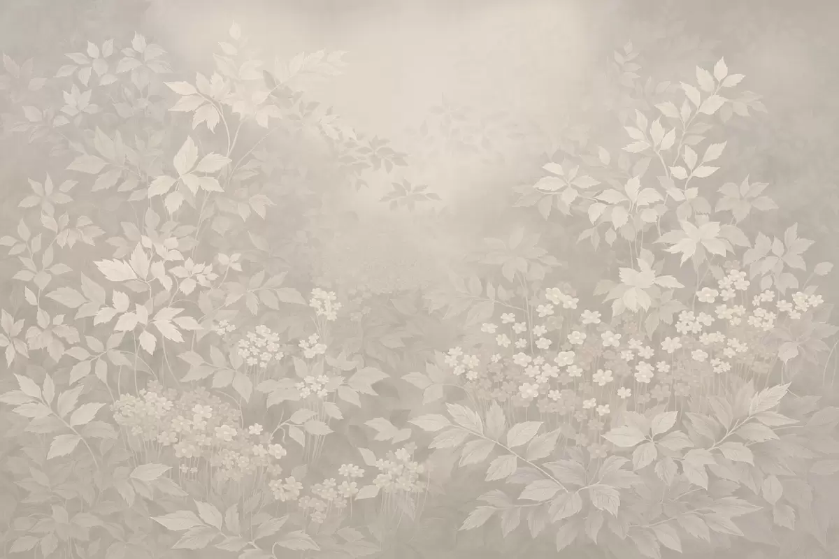 Fototapet Blødt botanisk mønster med blade og blomster i tåge Nr. w05115v1