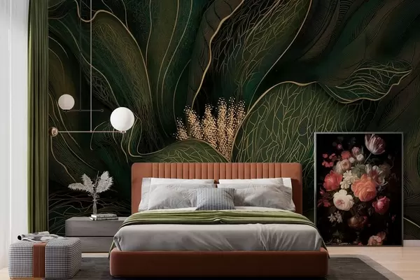 Fototapet Mørkegrøn, abstrakt blomst med fine linjedetaljer Nr. w05119v1