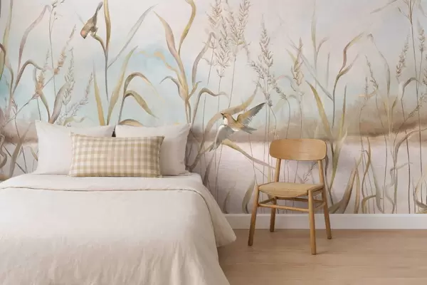 Fototapet Illustration af siv og fugle ved vandet i bløde toner Nr. w05125