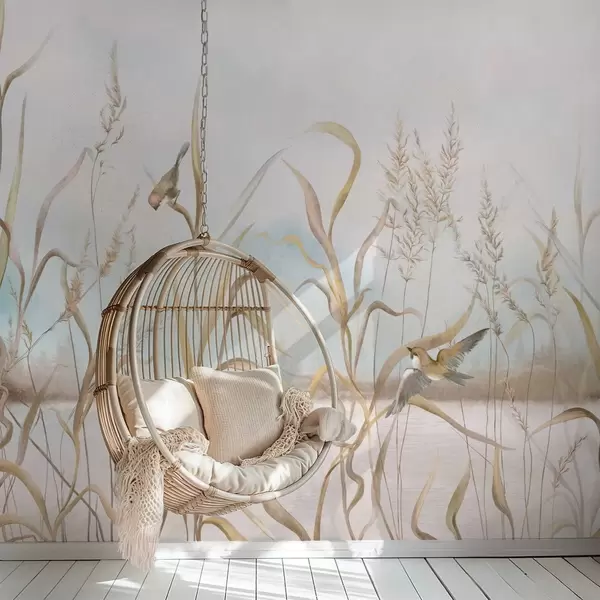 Fototapet Illustration af siv og fugle ved vandet i bløde toner Nr. w05125