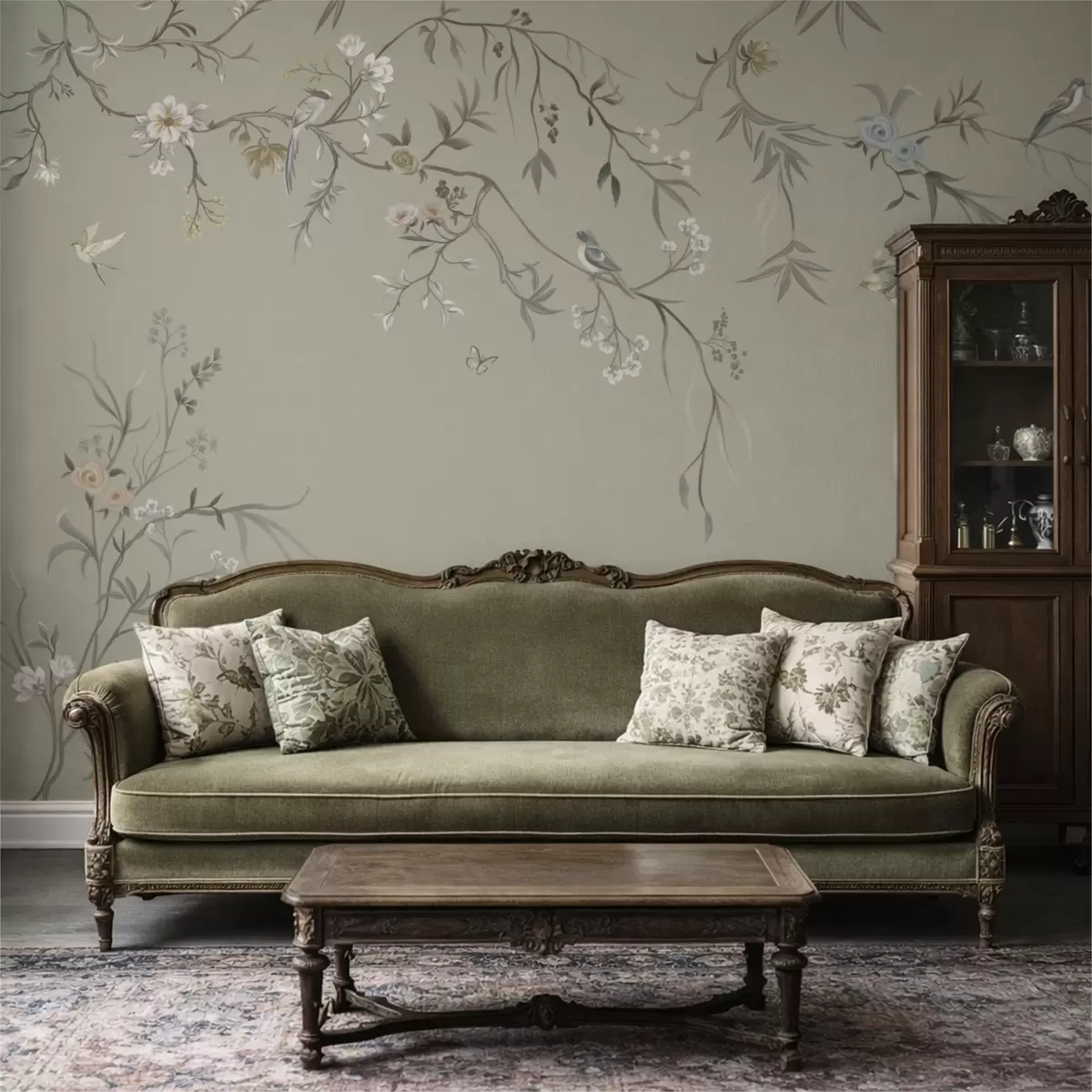 Fototapet Blomstermønster med fugle på kølig baggrund Nr. w05127v6