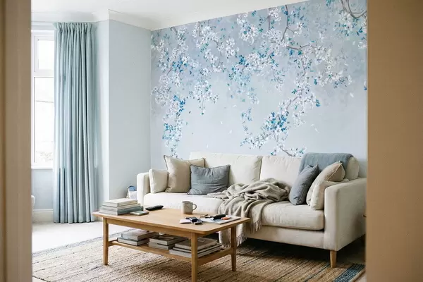 Fototapet Grene med hvide og blå blomster på en kølig baggrund Nr. w05129v2