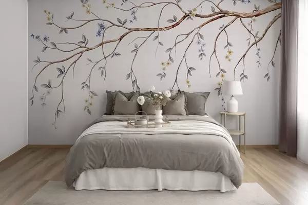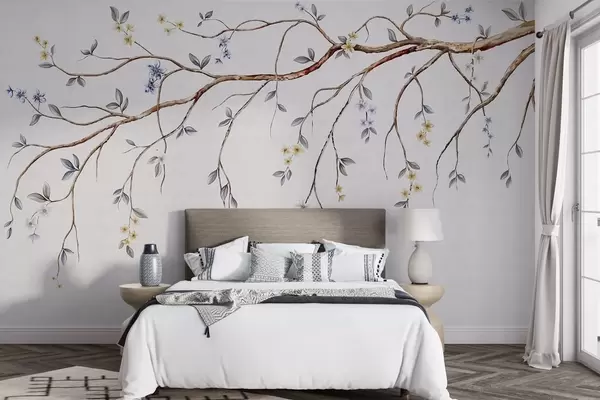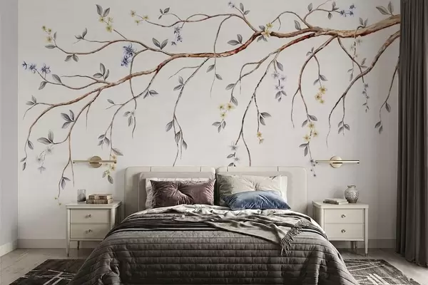 Fototapet Tynde grene med små blomster på lys baggrund Nr. w05145