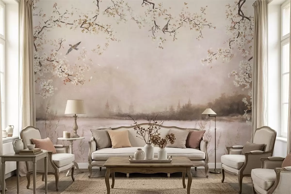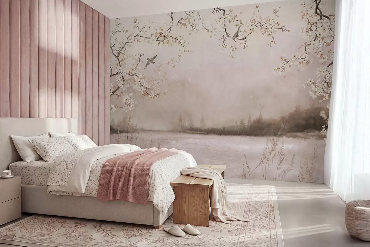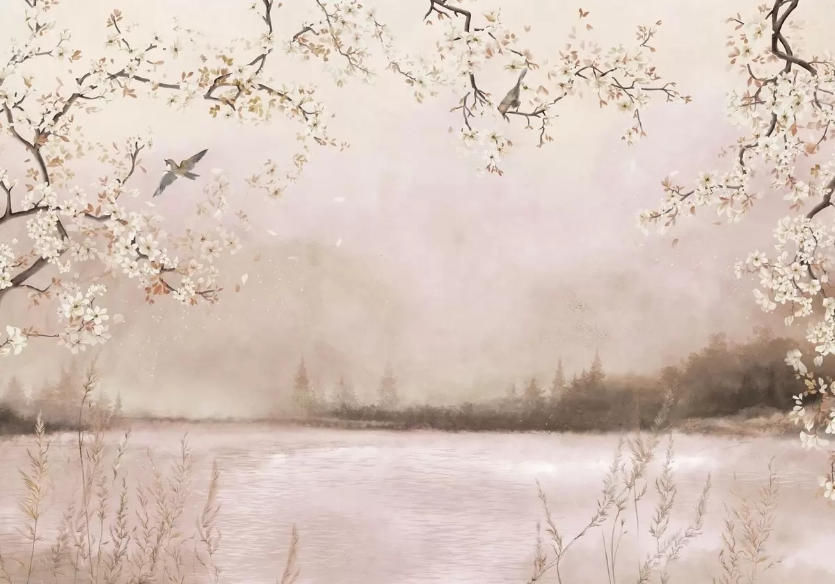 Fototapet Blomstrende grene over rolig sø med fugle i tågen Nr. w05155v1