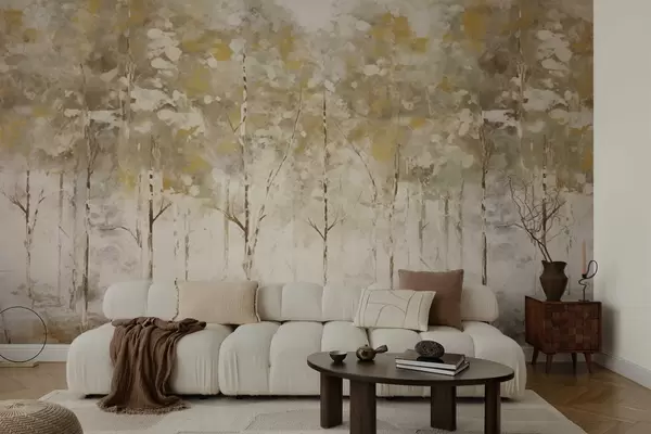 Fototapet Stiliseret skov med slanke træer i varme farver Nr. w05221