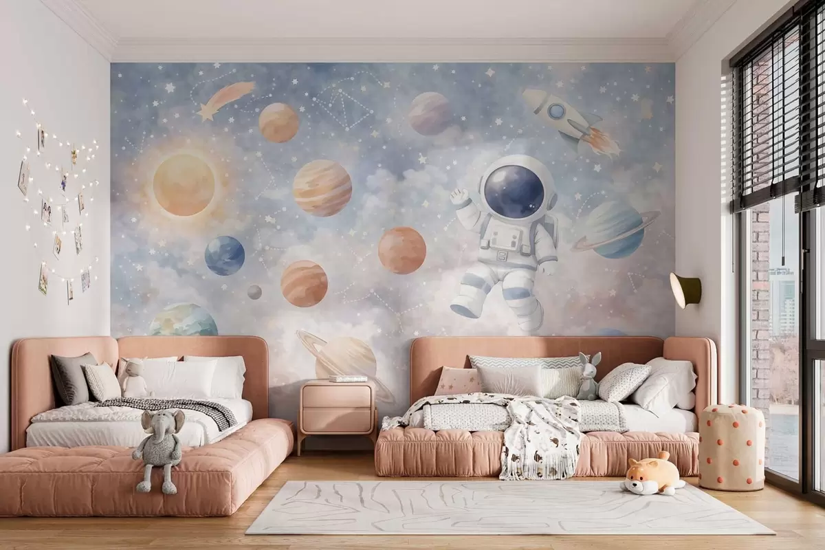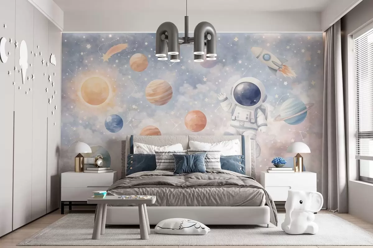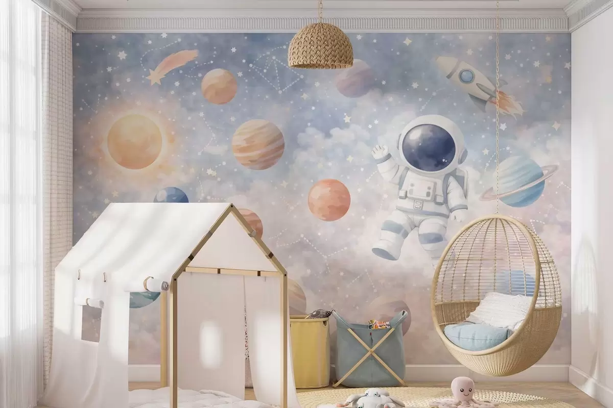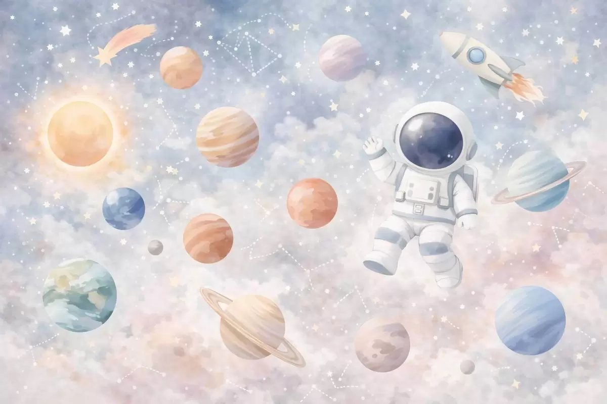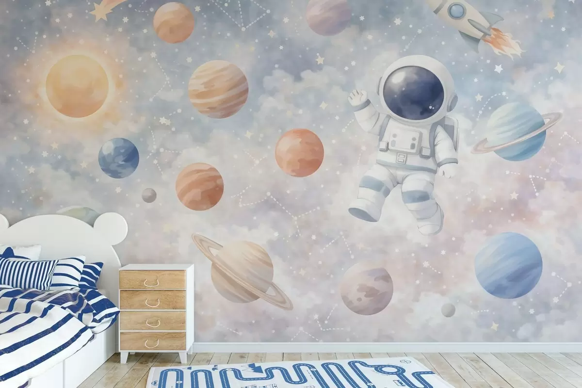 Fototapet en lille astronaut blandt planeter og stjerner Nr. w05233