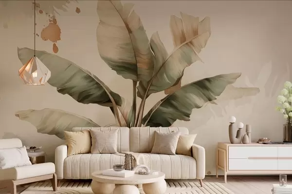 Fototapet en stor, malerisk klynge af bananblade med farvestænk i retrostil Nr. w05384