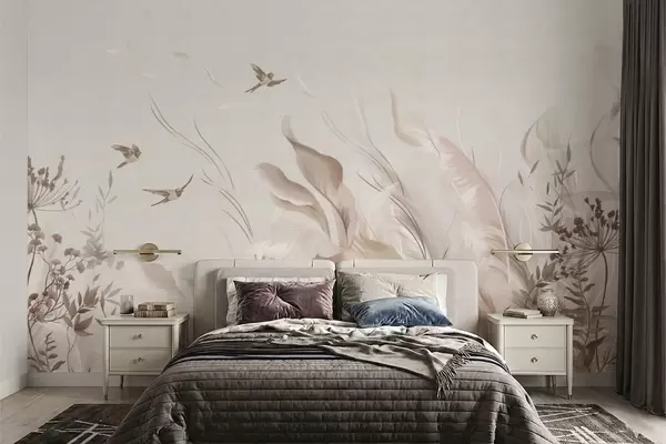 Fototapet Bløde fjer, græs og fugle i lyse nuancer Nr. w05395