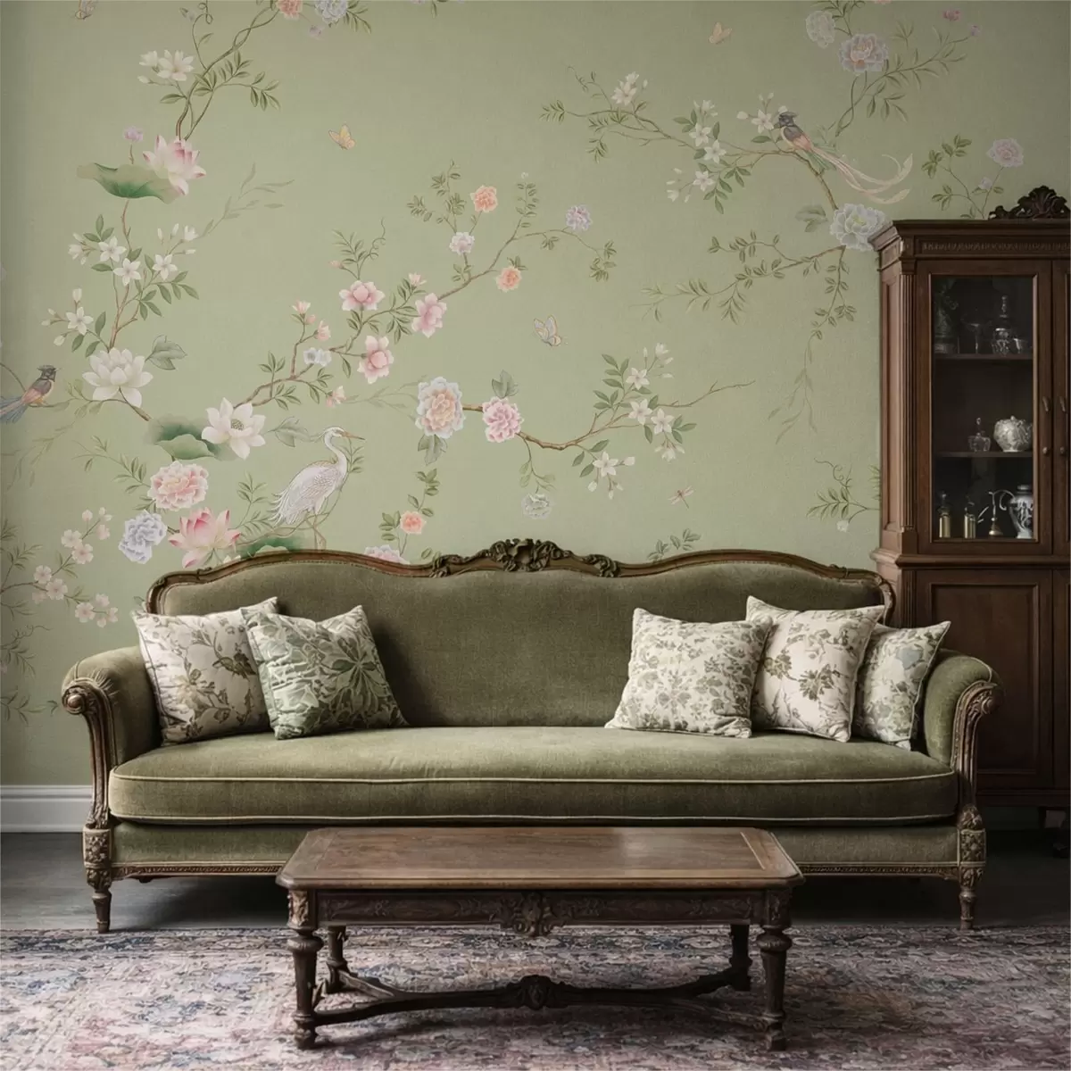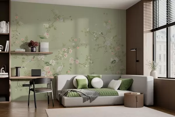 Fototapet Blomstrende grene med fugle på lysegrøn baggrund Nr. w05416
