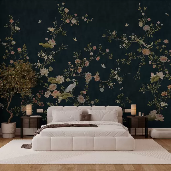Fototapet Blomstrende grene med fugle på mørk baggrund Nr. w05416v3