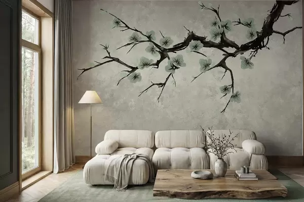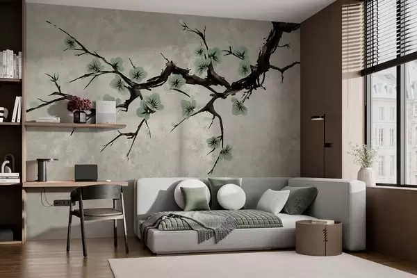 Fototapet En gren med grønne blomster i rolige farver Nr. w05425v2