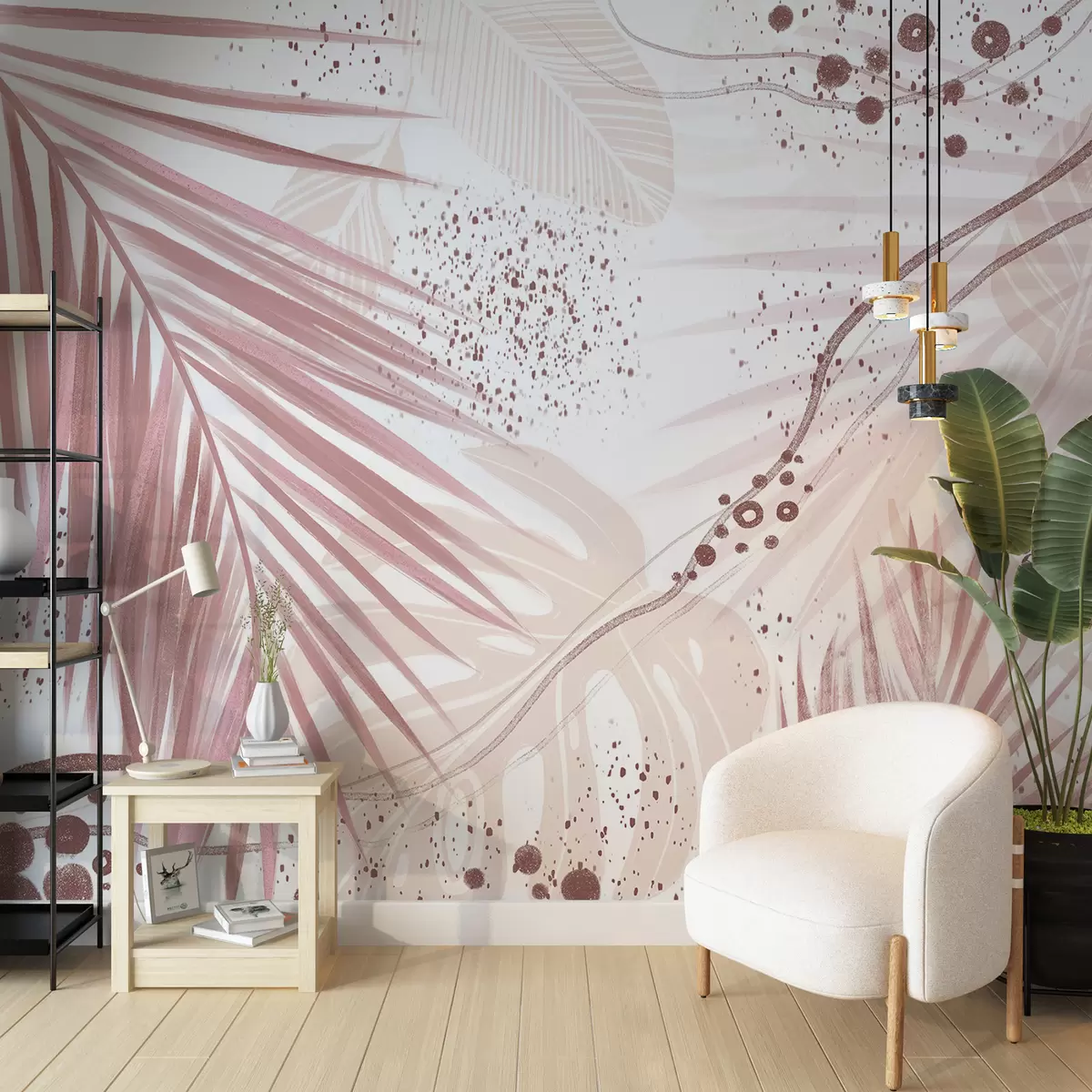 Fototapet En tropisk pink palmeblade og blade, med abstrakte former og stænk i nuancer af pink og hvid Nr. w07918v1