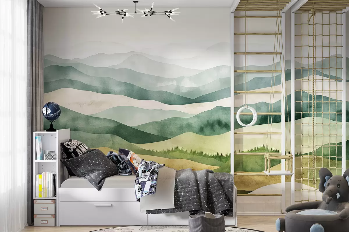 Fototapet Akvarel bjerge landskaber, skov, naturlige grønne og beige farver Nr. w07950
