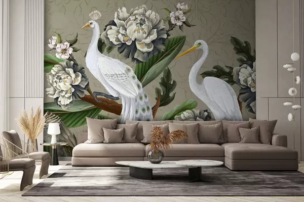 Fototapet Et par hvide påfugle med lange haler omgivet af store hvide pæonblomster og frodigt grønt løv Nr. w07975